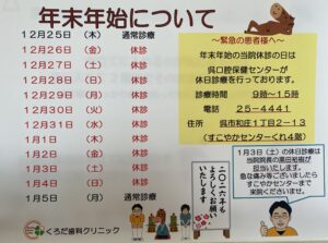今年の年末年始の休診は12月26日~1月4日までとさせていただきます。12月25日は今年最後の診療日となります。1月5日から通常診療となります。